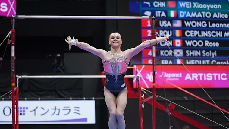Ангелина Мельникова после выступления на разновысоких брусьях в финале личного многоборья. Toru Hanai/Getty Images