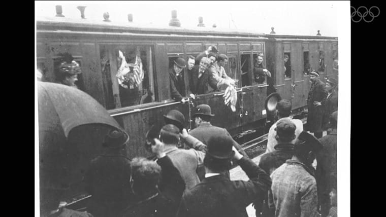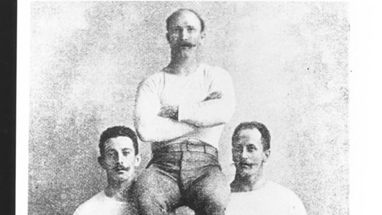 3 Apr 1896: Louis Spiridon (centre) of Greece receives his gold medal at the medal ceremony for winning the Marathon event during the 1896 Olympic Games in Athens, Greece. \ Mandatory Credit: IOC/Olympic Museum /Allsport
