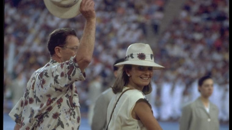 Barcelona 1992 OG, Opening Ceremony - Parade of athletes. Maria Teresa SAMARANCH and a member of the delegation of Australia (AUS).