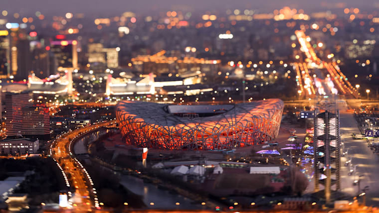 BEIJING, CHINA - JANUARY 16: (EDITOR'S NOTE: This image was created with a tilt and shift lens) A general view the Birds Nest stadium, the venue for opening and closing ceremonies for the 2022 Winter Olympics at Beijing Olympic Tower on January 16, 2022 in Beijing, China. The Beijing 2022 Winter Olympics are set to open February 4th. (Photo by Lintao Zhang/Getty Images)