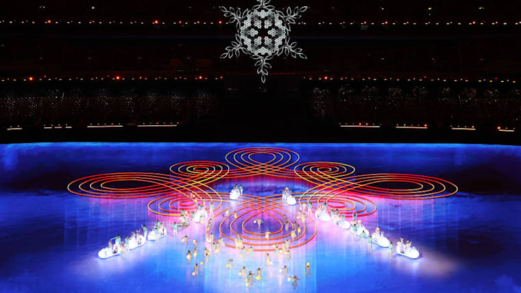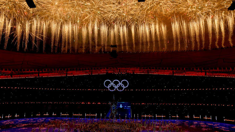 BEIJING, CHINA - FEBRUARY 20: A firework display is seen inside the stadium alongside the Olympic rings during the Beijing 2022 Winter Olympics Closing Ceremony on Day 16 of the Beijing 2022 Winter Olympics at Beijing National Stadium on February 20, 2022 in Beijing, China. (Photo by Lintao Zhang/Getty Images)
