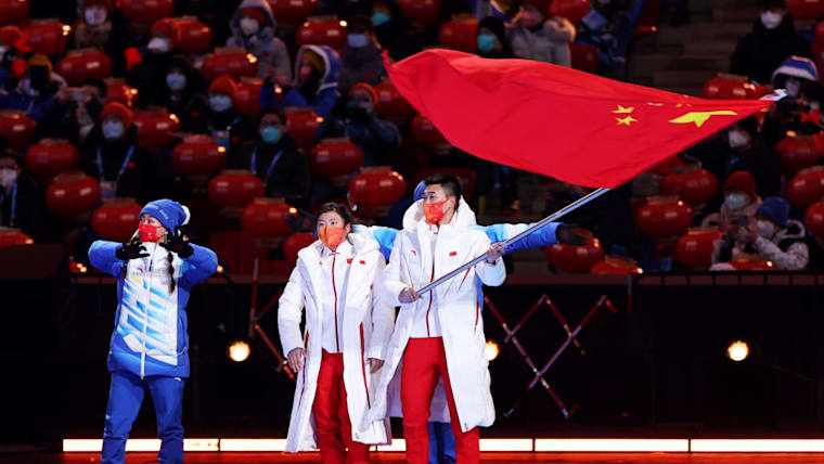 BEIJING, CHINA - FEBRUARY 20: Members of Team China wave flags as they walk in the Athletes Parade during the Beijing 2022 Winter Olympics Closing Ceremony on Day 16 of the Beijing 2022 Winter Olympics at Beijing National Stadium on February 20, 2022 in Beijing, China. (Photo by Lintao Zhang/Getty Images)