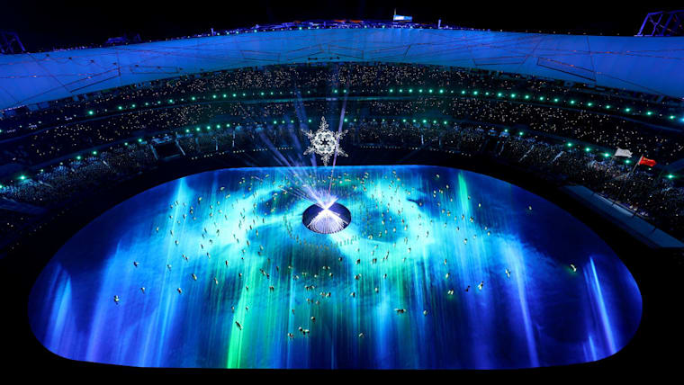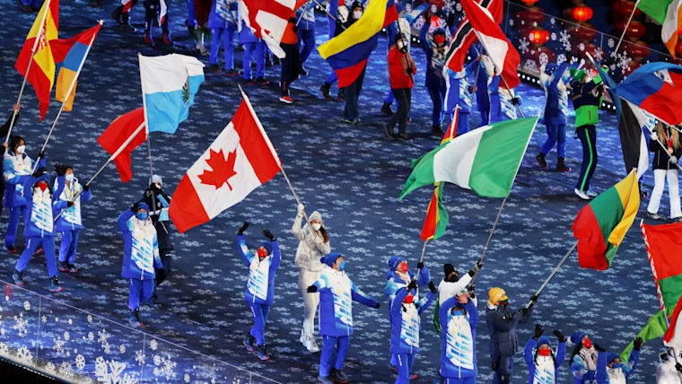 BEIJING, CHINA - FEBRUARY 20: Flag bearers make their way into the Beijing National Stadium during the Beijing 2022 Winter Olympics Closing Ceremony on Day 16 of the Beijing 2022 Winter Olympics at Beijing National Stadium on February 20, 2022 in Beijing, China. (Photo by Richard Heathcote/Getty Images)