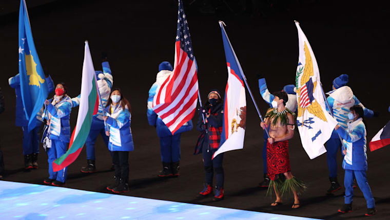 BEIJING, CHINA - FEBRUARY 20: Flag bearer Nathan Crumpton of Team American Samoa (2nd right) walks in the Athletes Parade during the Beijing 2022 Winter Olympics Closing Ceremony on Day 16 of the Beijing 2022 Winter Olympics at Beijing National Stadium on February 20, 2022 in Beijing, China. (Photo by Sarah Stier/Getty Images)