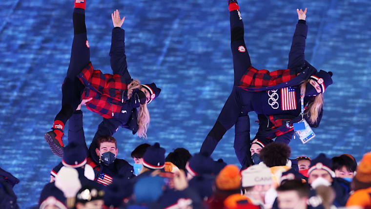 BEIJING, CHINA - FEBRUARY 20: Members of Team USA react as they make their way around the Beijing National Stadium during the Beijing 2022 Winter Olympics Closing Ceremony on Day 16 of the Beijing 2022 Winter Olympics at Beijing National Stadium on February 20, 2022 in Beijing, China. (Photo by Lintao Zhang/Getty Images)