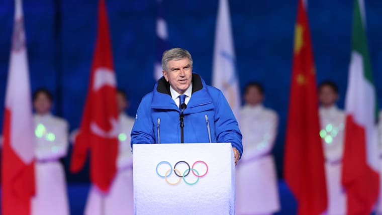 BEIJING, CHINA - FEBRUARY 20: International Olympic Committee President Thomas Bach gives a speech during the Beijing 2022 Winter Olympics Closing Ceremony on Day 16 of the Beijing 2022 Winter Olympics at Beijing National Stadium on February 20, 2022 in Beijing, China. (Photo by Lintao Zhang/Getty Images)