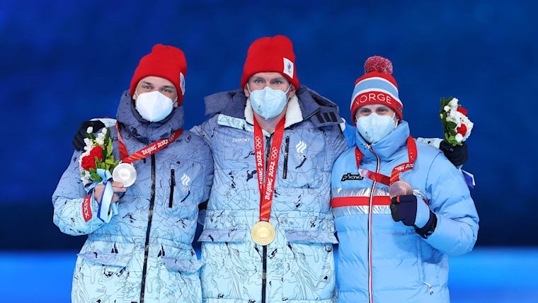 BEIJING, CHINA - FEBRUARY 20: Gold medallist Alexander Bolshunov of Team ROC (C), Silver medallist Ivan Yakimushkin of Team ROC (L) and Bronze medallist Simen Hegstad Krueger of Team Norway (R) pose with their medals during the Men's Cross-Country Skiing 50km Mass Start Free medal ceremony during the Beijing 2022 Winter Olympics Closing Ceremony on Day 16 of the Beijing 2022 Winter Olympics at Beijing National Stadium on February 20, 2022 in Beijing, China. (Photo by Lintao Zhang/Getty Images)