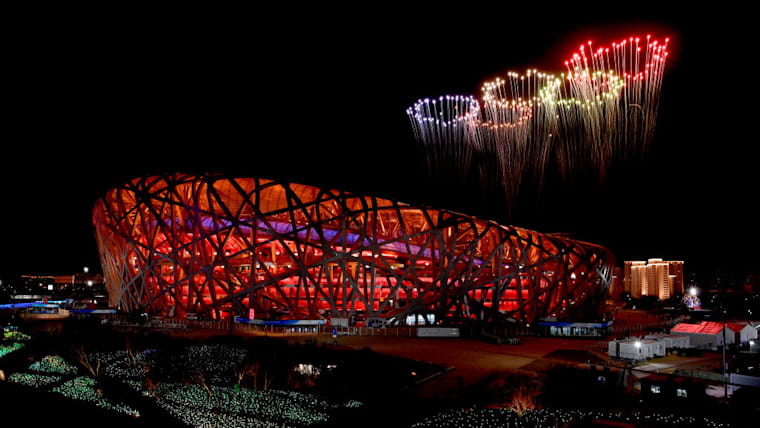 BEIJING, CHINA - FEBRUARY 20: A firework display is seen above the stadium during the Beijing 2022 Winter Olympics Closing Ceremony on Day 16 of the Beijing 2022 Winter Olympics at Beijing National Stadium on February 20, 2022 in Beijing, China. (Photo by Catherine Ivill/Getty Images)
