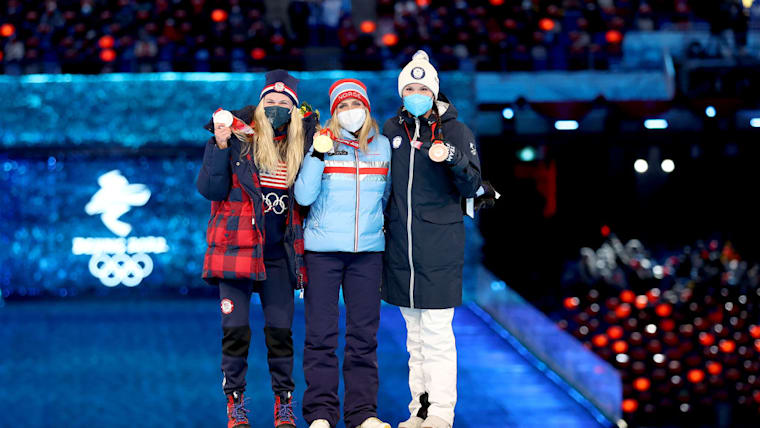 BEIJING, CHINA - FEBRUARY 20: Gold medallist Therese Johaug of Team Norway (C), Silver medallist Jessie Diggins of Team United States (L) and Bronze medallist Kerttu Niskanen of Team Finland (R) pose with their medals during the Women's 30km Mass Start medal ceremony during the Beijing 2022 Winter Olympics Closing Ceremony on Day 16 of the Beijing 2022 Winter Olympics at Beijing National Stadium on February 20, 2022 in Beijing, China. (Photo by Maja Hitij/Getty Images)