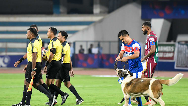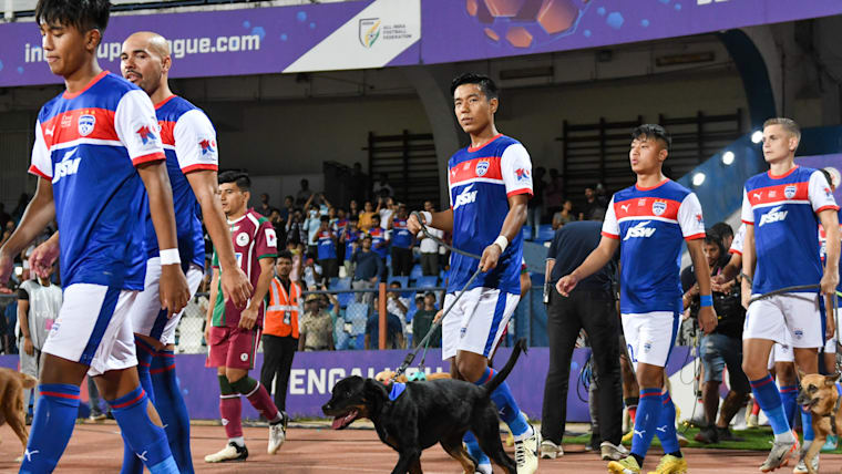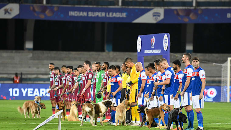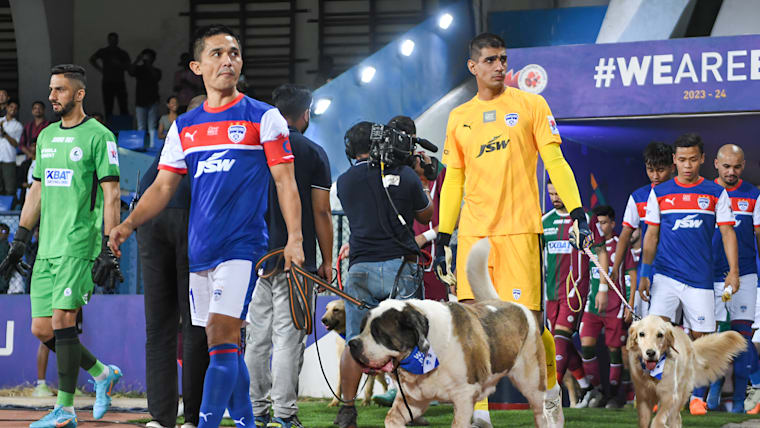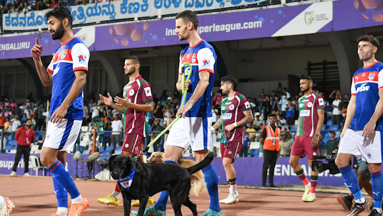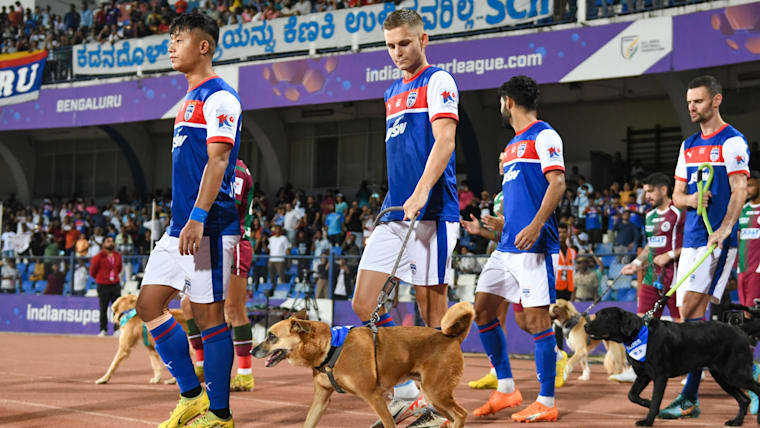 Bengaluru FC and Mohun Bagan Super Giant players walking out with rescued dogs ahead of their ISL 2023-34 match