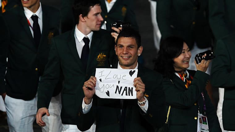 Damien Hooper of Australia displays the message 'I love you Nan' as he parades around the stadium with the rest of the Australia team during the Opening Ceremony of the London 2012 Olympic Games.
