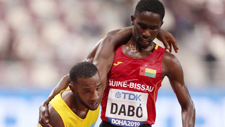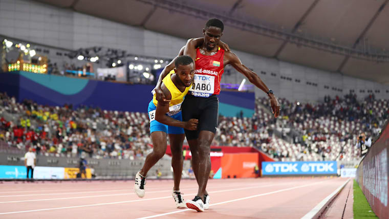 Braima Suncar Dabo helps Jonathan Busby in their 5000m heat on day one of the 2019 IAAF World Championships in Doha