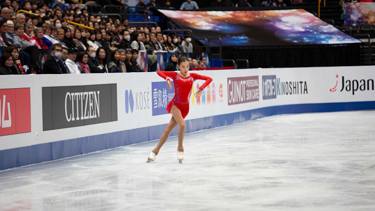 Elizabet Tursynbaeva performs during her free skate at the World Championships