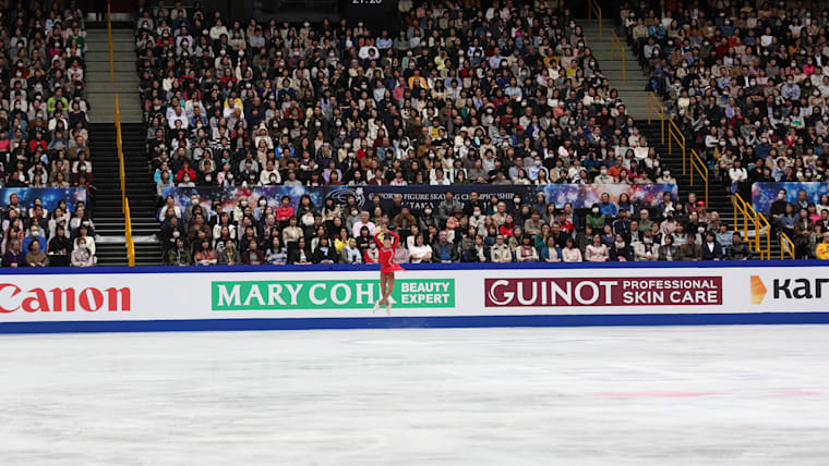 Elizabet Tursynbaeva acknowledges the crowd after her free skate featuring a quad Salchow at the 2019 World Championships in Saitama