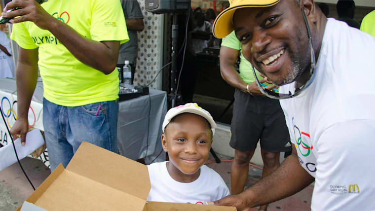 The Olympic Day. An organisator showing to a child a cake with the Olympic rings.