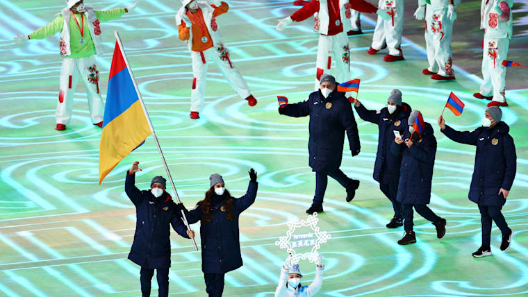 Members of Team Armenia are seen during the Opening Ceremony of the Beijing 2022 Winter Olympics at the Beijing National Stadium on February 04, 2022.