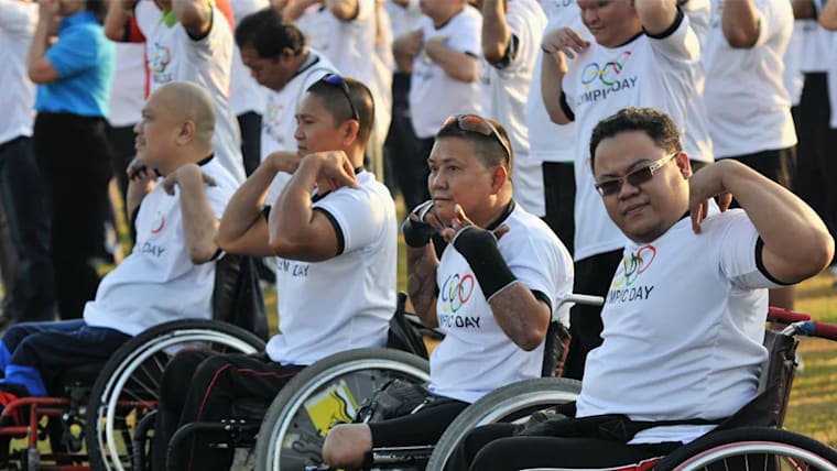 The Olympic Day. Participants doing stretching exercises.