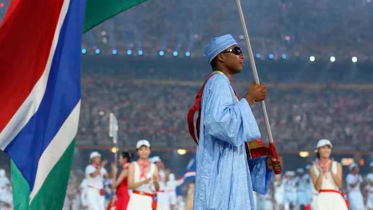BEIJING - AUGUST 08: Boxer Badou Jack of Gambia carries his country's flag during the Opening Ceremony for the 2008 Beijing Summer Olympics at the National Stadium on August 8, 2008 in Beijing, China.