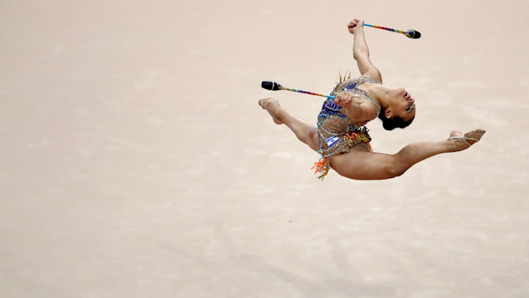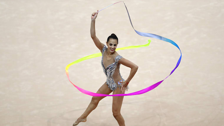 Linoy Ashram competing in the ribbon at the European Games in Minsk