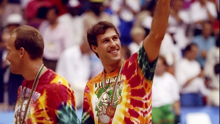 8 Aug 1992: Team Lithuania celebrates after winning the bronze at the Olympic Games in Barcelona, Spain.