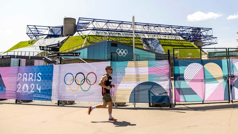 PARIS, FRANCE - JULY 17: A man runs along the Bercy arena hosting Artistic Gymnastics, Basketball and Trampoline ahead of Paris 2024 Olympic Games on July 17, 2024 in Paris, France. (Photo by Maja Hitij/Getty Images)