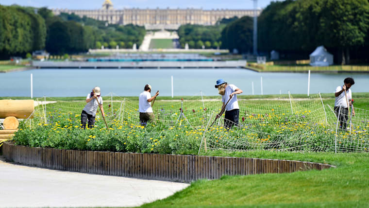 PARIS, FRANCE - JULY 17: Workers preparing the Horse riding area in front of the Chateau de Versailles ahead of the Paris 2024 Olympic Games on July 17, 2024 in Paris, France. The Chateuau will host the Equestrian, Modern Pentathlon and Para Equestrian competitions. (Photo by Franco Arland/Getty Images)