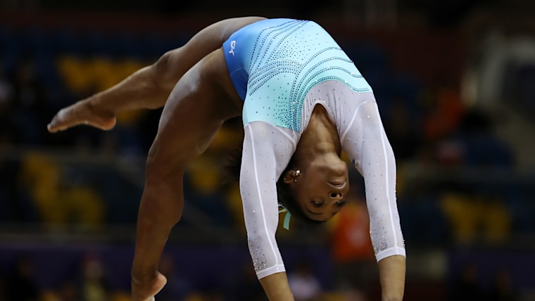 Simone Biles tumbles on the balance beam during the all-around final at the 2018 Worlds