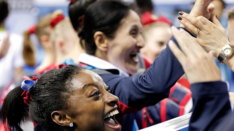 Simone Biles salutes after vaulting at the 2014 Worlds