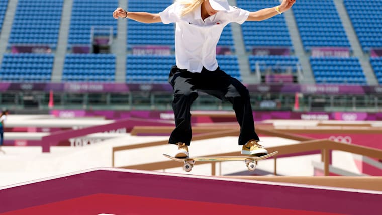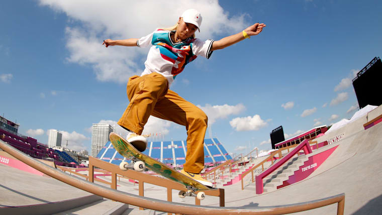 Aori Nishimura of Team Japan practices on the skateboard street course ahead of the 2020 Tokyo Summer Olympic Games at the Ariake Urban Sports Park on July 22, 2021 in Tokyo, Japan. The Ariake Urban Sports Park will host skateboarding and BMX cycling events. (Photo by Ezra Shaw/Getty Images)