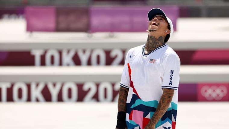 Nyjah Huston of Team USA reacts at the Skateboarding Men's Street Finals on day two of the Tokyo 2020 Olympic Games at Ariake Urban Sports Park on July 25, 2021 in Tokyo, Japan. (Photo by Ezra Shaw/Getty Images)