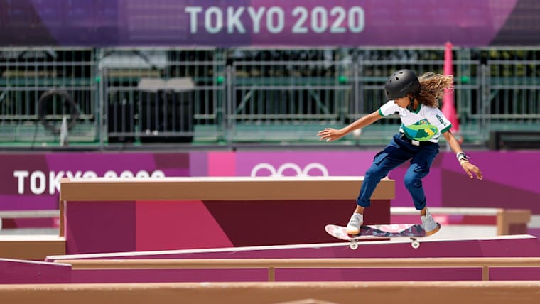 Rayssa Leal of Team Brazil practices on the skateboard street course ahead of the 2020 Tokyo Summer Olympic Games at the Ariake Urban Sports Park on July 22, 2021 in Tokyo, Japan. The Ariake Urban Sports Park will host skateboarding and BMX cycling events. (Photo by Ezra Shaw/Getty Images)