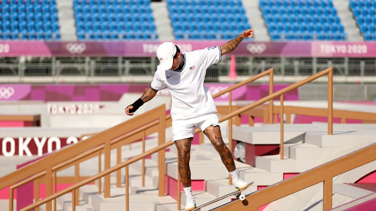 Nyjah Huston of Team United States practices on the skateboard street course ahead of the Tokyo 2020 Olympic Games on July 21, 2021 in Tokyo, Japan. Skateboarding is one of new sports at 2021 Olympics Summer Games . (Photo by Ezra Shaw/Getty Images)