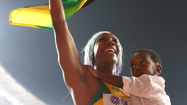 The greatest prize of all: Shelly Ann Fraser-Pryce holds son Zion after winning the women's 100m final at the Doha 2019 World Championships