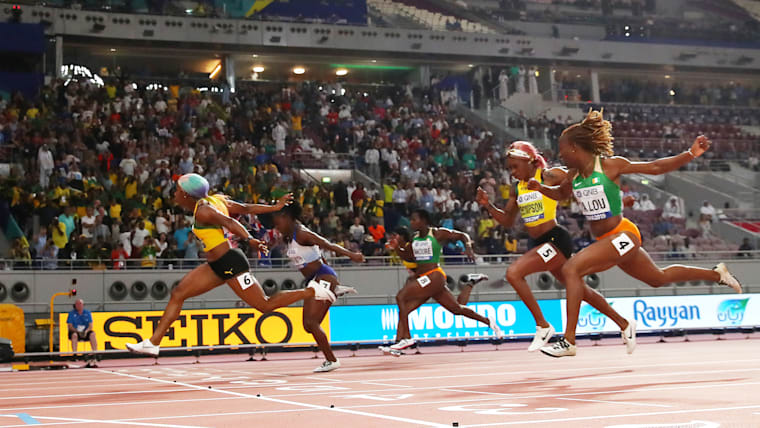 Shelly-Ann Fraser-Pryce of Jamaica crosses the finish line to win the Women's 100 Metres final in the Women's 100 Metres final during day three of 17th IAAF World Athletics Championships Doha 2019 at Khalifa International Stadium on September 29, 2019 in Doha, Qatar. (Photo by Michael Steele/Getty Images)