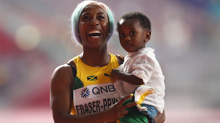 Shelly-Ann Fraser-Pryce with son Zyon after her 100m triumph at the 2019 IAAF World Championships in Doha