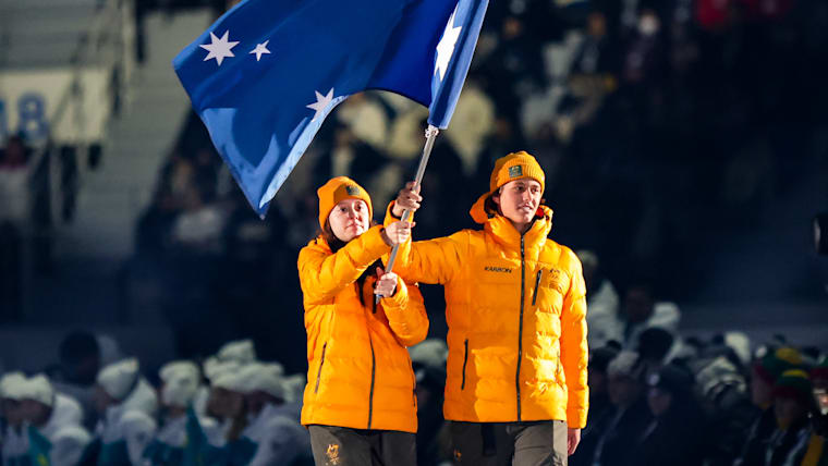 Duncan Cowan (Freestyle Skiing) and Tara Baker (Ice Hockey) AUS carry the flag into the stadium for the Australia Youth Olympic Team during the Opening Ceremony at the Gangneung Oval. The Winter Youth Olympic Games, Gangwon, Republic of Korea, Friday 19 January 2024.
