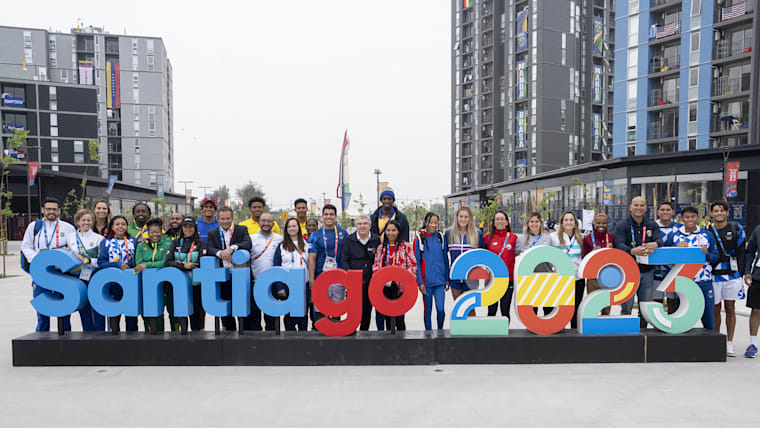 IOC / Greg Martin. Thomas Bach with some athletes at the Pan Am Games Athletes’ Village.