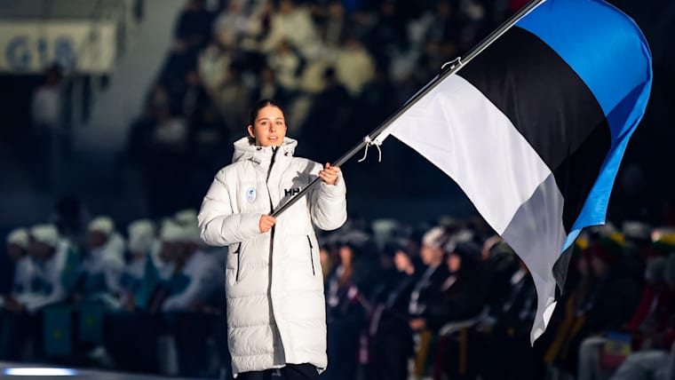 Mirjam Revjagin (Freestyle Skiing) carries the flag into the stadium for the Estonia Youth Olympic Team during the Opening Ceremony at the Gangneung Oval. The Winter Youth Olympic Games, Gangwon, Republic of Korea, Friday 19 January 2024.