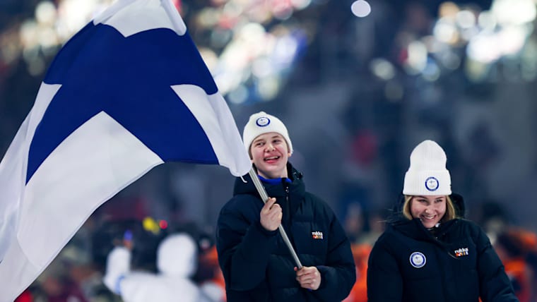 Eeli Keranen (Ski Jumping) and Hanni Koski (Biathlon & Cross-Country Skiing) carry the flag into the stadium for the Finland Youth Olympic Team during the Opening Ceremony at the Gangneung Oval. The Winter Youth Olympic Games, Gangwon, Republic of Korea, Friday 19 January 2024.