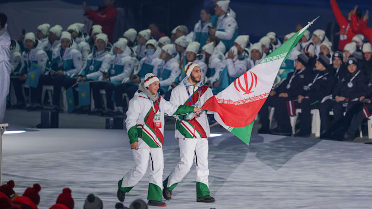 In the spotlight Ali Boloukat (Alpine Skiing) and Parastoo Absalan (Cross-Country Skiing) carry the flag into the stadium for the Islamic Republic of Iran Youth Olympic Team during the Opening Ceremony at the Gangneung Oval. The Winter Youth Olympic Games, Gangwon, Republic of Korea, Friday 19 January 2024.