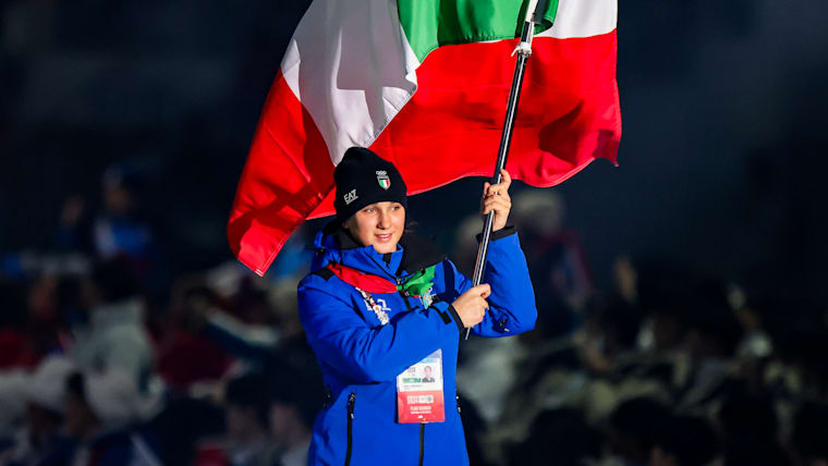 Flora Tabanelli (Freestyle Skiing) carries the flag into the stadium for the Italy Youth Olympic Team during the Opening Ceremony at the Gangneung Oval. The Winter Youth Olympic Games, Gangwon, Republic of Korea, Friday 19 January 2024.