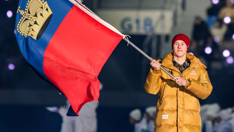 Noah Gianesini (Alpine Skiing) carries the flag into the stadium for the Liechtenstein Youth Olympic Team during the Opening Ceremony at the Gangneung Oval. The Winter Youth Olympic Games, Gangwon, Republic of Korea, Friday 19 January 2024.