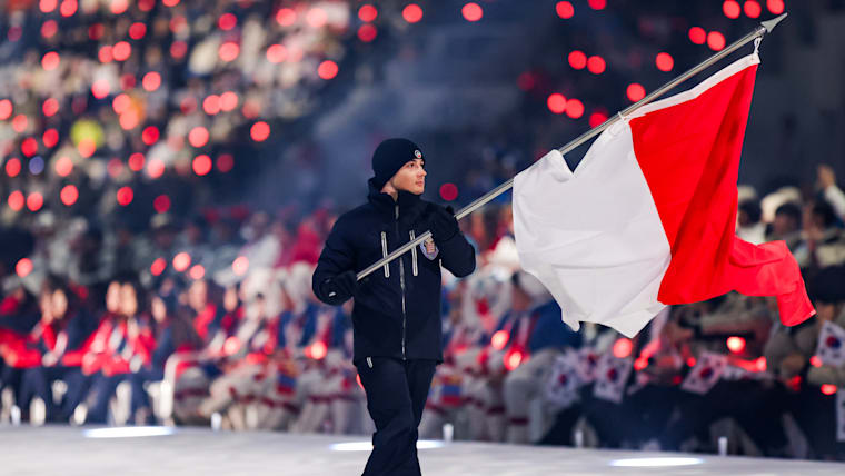 Hugo Leonelli (Alpine Skiing) carries the flag into the stadium for the Monaco Youth Olympic Team during the Opening Ceremony at the Gangneung Oval. The Winter Youth Olympic Games, Gangwon, Republic of Korea, Friday 19 January 2024.