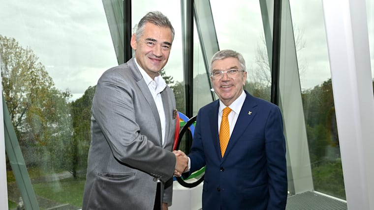IOC/Christophe Moratal. The IOC President welcomed Olympic Committee of North Macedonia President Daniel Dimevski.