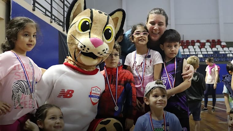 NOC. Children from the French International School in Asunción with the Paraguay team’s official mascot Tirika.