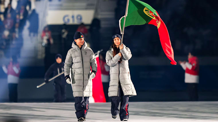 Emeric Guerillot (Alpine Skiing) and Jessica Rodrigues (Speed Skating) carry the flag into the stadium for the Portugal Youth Olympic Team during the Opening Ceremony at the Gangneung Oval. The Winter Youth Olympic Games, Gangwon, Republic of Korea, Friday 19 January 2024.