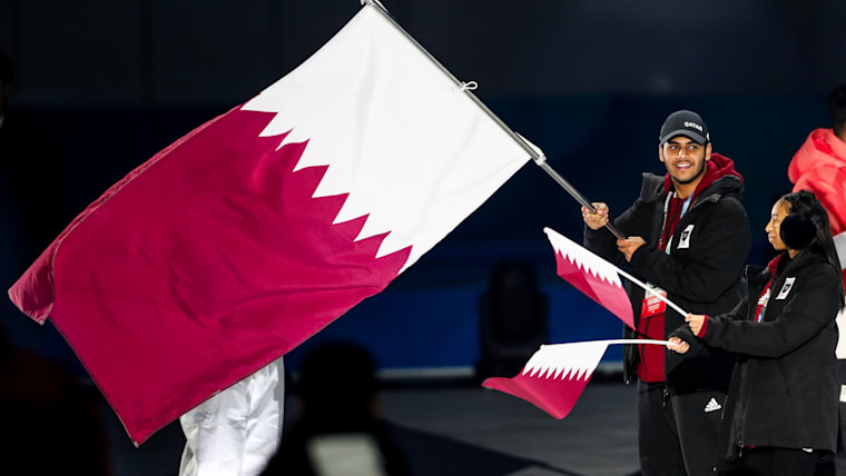 Mohammed Alnaimi (Curling) and Aldana Al-Fahad (Curling) QAT carry the flag into the stadium for the Qatar Youth Olympic Team during the Opening Ceremony at the Gangneung Oval. The Winter Youth Olympic Games, Gangwon, Republic of Korea, Friday 19 January 2024.