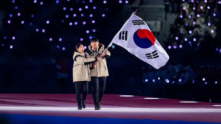 Jaehwan So (Bobsleigh) and Hyeonjeong Jang (Ice Hockey) carry the flag into the stadium for the Republic of Korea Youth Olympic Team during the Opening Ceremony at the Gangneung Oval. The Winter Youth Olympic Games, Gangwon, Republic of Korea, Friday 19 January 2024.