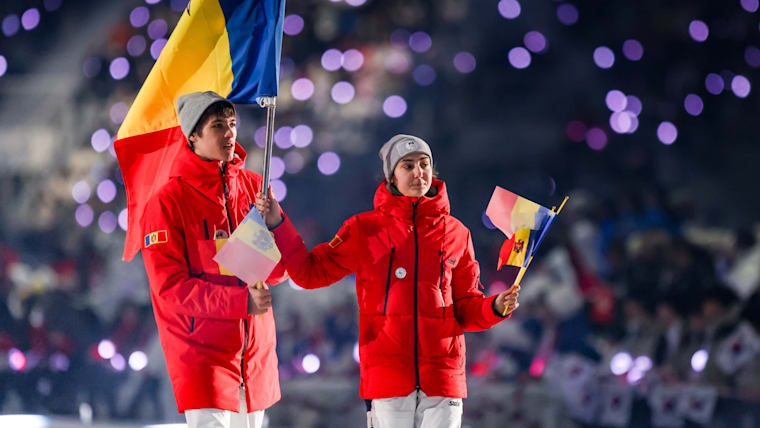 In spotlight Dinu Belevac (Biahthlon) and Arina Rusu (Biathlon) carry the flag into the stadium for the Republic of Moldova Youth Olympic Team during the Opening Ceremony at the Gangneung Oval. The Winter Youth Olympic Games, Gangwon, Republic of Korea, Friday 19 January 2024.