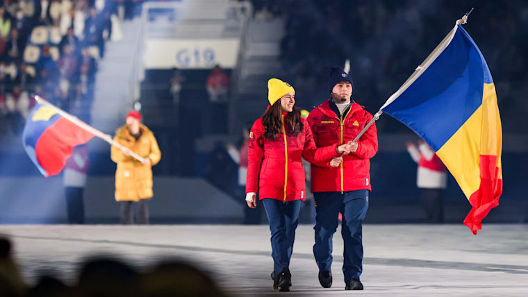 Sami Florin Dicu Mihai (Bobsleigh) and Kata Mandel (Snowboard) carry the flag into the stadium for the Romania Youth Olympic Team during the Opening Ceremony at the Gangneung Oval. The Winter Youth Olympic Games, Gangwon, Republic of Korea, Friday 19 January 2024.